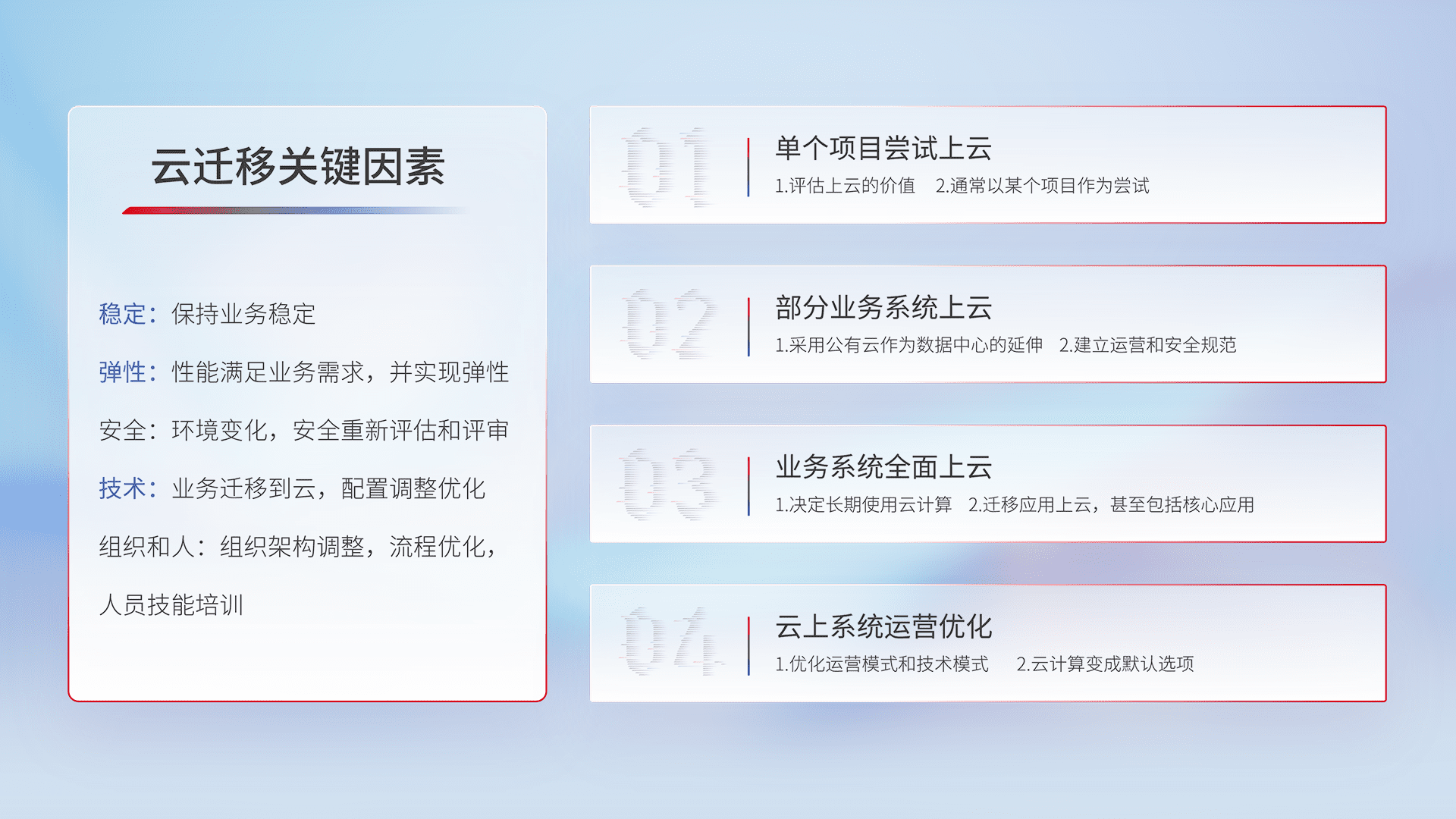 结合实际业务,,,,从规划设计、、云平台选型、、、云原生改造、、、、数据迁移、、、、集成交付,,,,迁移全过程为客户识别最佳上云路径,,,做好风险识别管理,,,设计网络架构、、、、身份权限、、安全审计合规、、、、操作审计、、、、日志审计、、、监控告警策略、、多站点容灾设计等,,,对云上基础设施进行整体规划,,,提升IT治理水平,,,,以满足弹性、、高可用、、、、高性能的需求。。。。