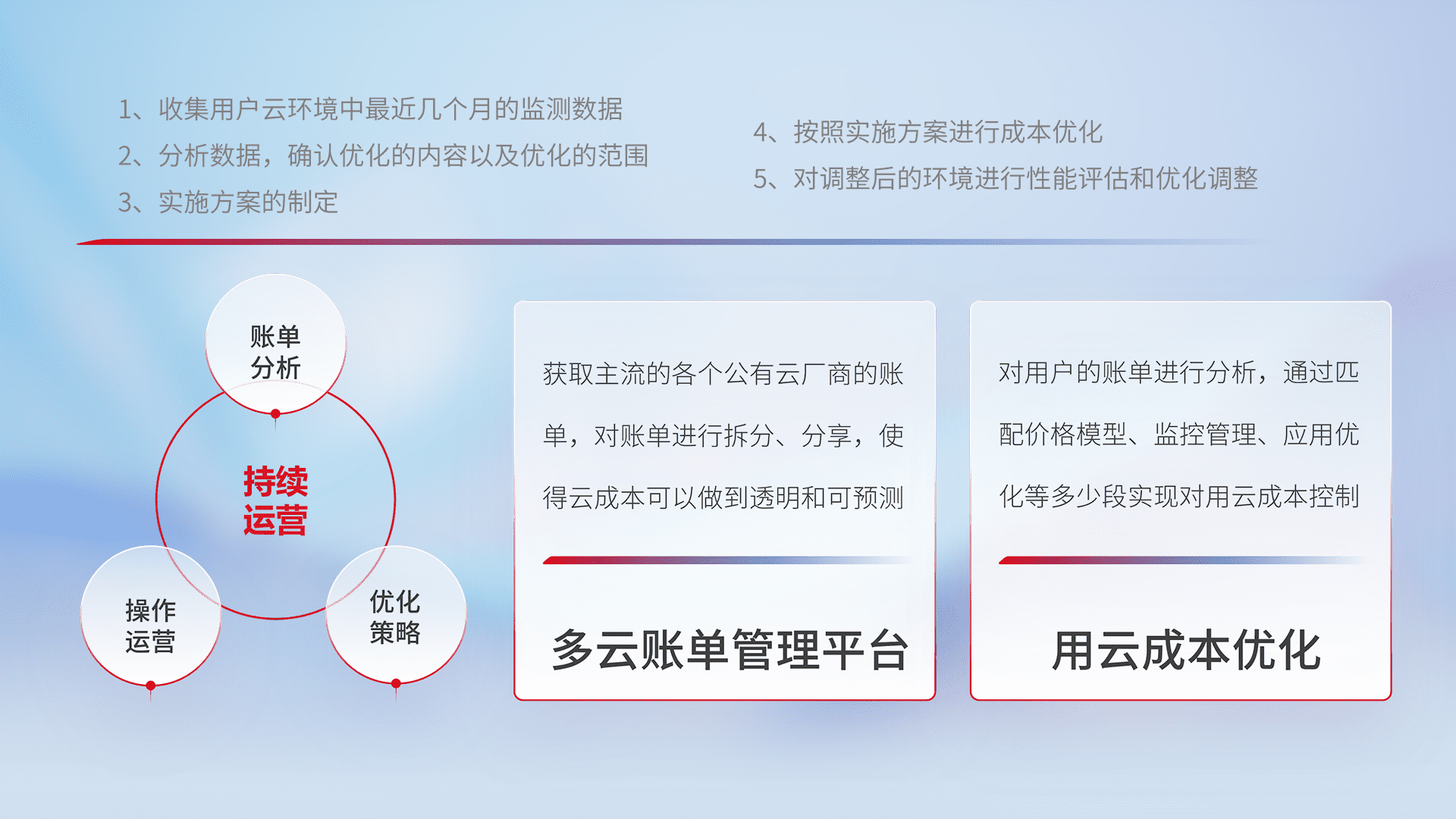 通过多云纳管,,,以统一的资源数据模型把客户的云资源进行抽象和封装,,进而实现对多云资源的统一操作,,,保障云资源管理的可靠性、、、稳定性与可用性。。。。量身定制化运维内容,,配置、、开发运维、、、、补丁管理、、备份、、、、监控、、、认证和访问管理、、、、审计和日常巡检等,,,,保障在用云过程中的可靠度,,,,稳定度以及高可用率。。。