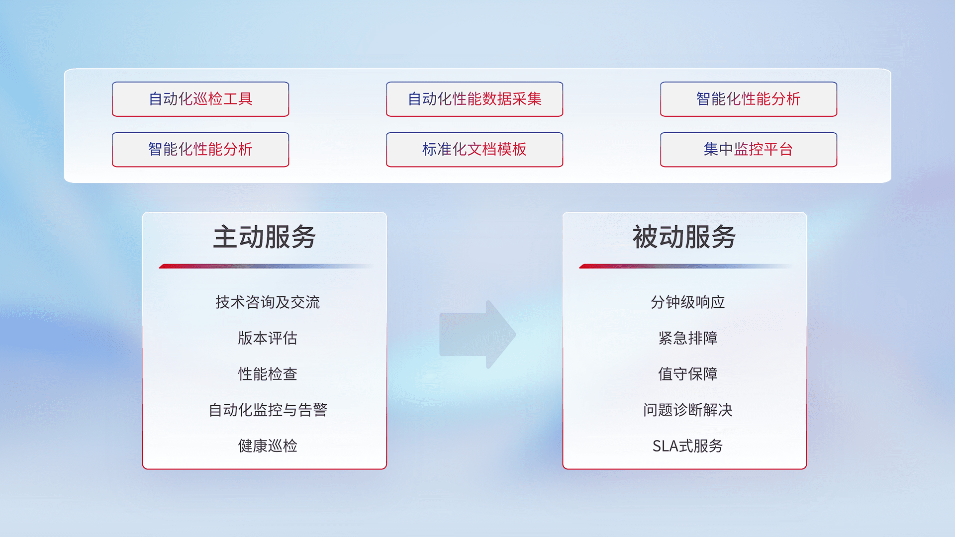 智能化工具和标准化文档,,保障服务质量,,,提供主动服务(包含技术咨询、、、版本评估、、、、性能检查、、自动化监控与告警、、、、健康巡检)和被动服务包含(分钟级响应、、、紧急排障、、、值守保障、、、、问题诊断解决、、、、SLA服务)。。。